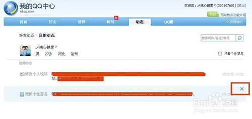 点击我的动态以后就会看到你更新过的QQ个性签名了,鼠标移动到要删除的签名处会出现一个删除的按钮,点击删除按钮就可以了