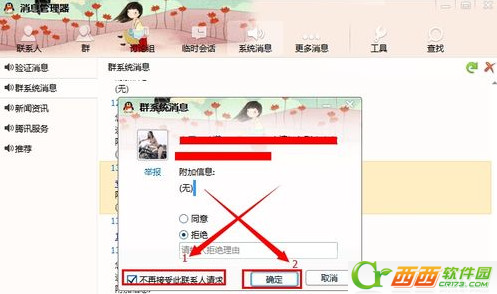 然后打钩“不在接受此联系人请求” ,点击“确定”,完成以上操作之后,就可以屏蔽一个群的邀请了。