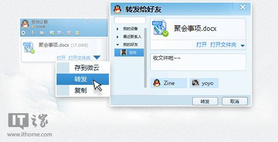 无论是接收还是发送的文件,都可以转发给新的小伙伴