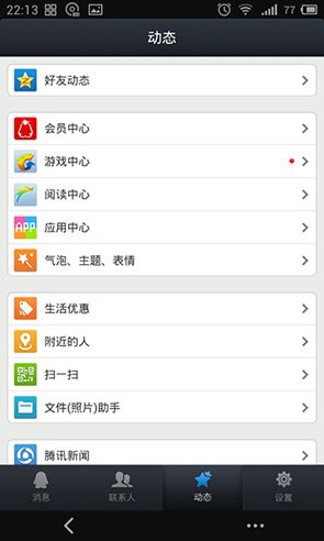 轻聊版在界面布局上相对完整版最大的改动就是去掉了“动态”一栏。此前完整版中的好友动态、会员中心、游戏中心、阅读中心、应用中心、生活优惠、腾讯新闻等栏目被统统拿掉,只在设置界面中保留了“附近的人”这一功能,由此可见虽然推出了精简的轻聊版,但是腾讯通过手机QQ拓展用户群的本意不会改变。
