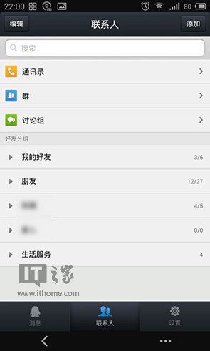 轻聊版消息栏上端暂时不显示广告,依旧支持分组管理,但是去掉了扫一扫功能。