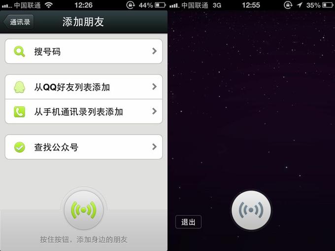 3)微信 5.0 新增了“按住按钮,添加身边朋友”的功能,点击通讯录菜单右上角的 + 号即可看到。