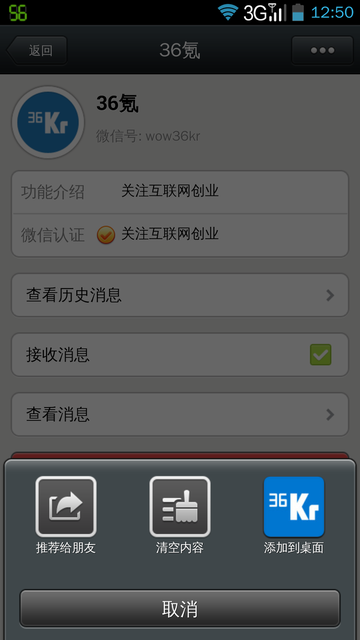 7)Android 版微信 5.0 还支持将公众账号添加到桌面,有点类似在桌面添加了一个 Widget。