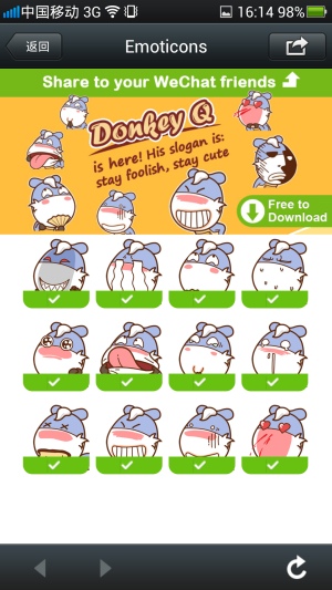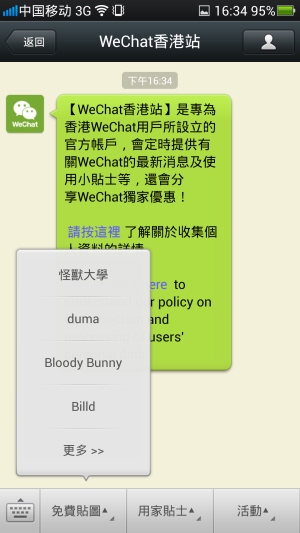 添加之后“wechat香港站”就会主动给你发送一条信息,在消息下方的工具栏中就可以看到“免费贴图”,点击之后选择更多,你就可以看到好多好多 表情了,而这些都是免费的,在表情图标上点击一下就会出现个下载标志“↓” ,这时就在自动下载安装表情了,已安装好的表情就会出现个已完成的“√”标志。