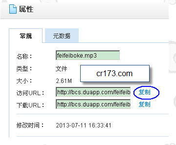 4)上传成功后,继续右键歌曲名,选择“属性”,然后复制该文件的“访问URL”,添加到QQ空间的网络背景音乐就OK啦!