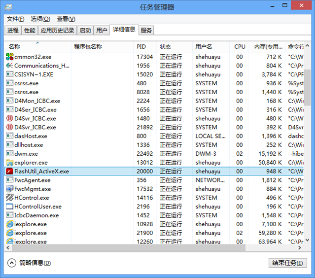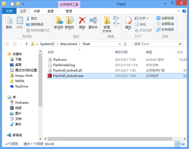 我们再来看看这个特殊的 Flash 在哪儿。打开任务管理器,可以发现名为 FlashUtil_ActiveX.exe 的进程,它就是 Win8 IE10 自带的 Flash 播放器插件的活动进程。它的文件位置位于 %SystemRoot%\System32\Macromed\Flash: