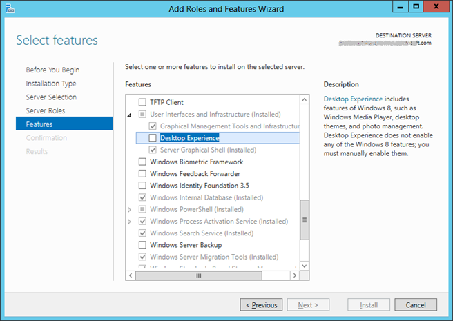 对于 Windows Server 2012,IE 默认是没有安装 Flash Player 的,有的用户尝试去下载安装 Flash Player,可是怎么也装不上,其原因也是因为 Server 2012 同样内置了这个特殊的 Flash Player,只是默认没有启用。所以,要使用 Server 2012 上的 IE10 浏览器访问 Flash 内容,只能启用内置的 Flash Player,做法是安装 User Interfaces and Infrastructure(用户界面和基础结构) - Desktop Experience(桌面体验) 功能。