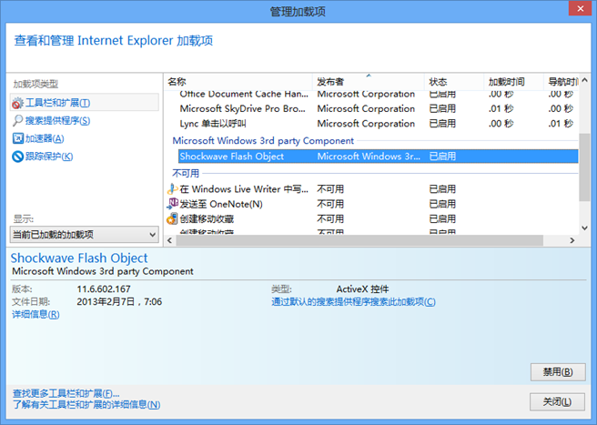 要管理此 Flash Player 的禁用与启用,我们还是通过 IE 浏览器的加载项管理工具来完成: