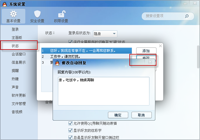 打开“系统设置”按钮后,选择“状态”选项,点击“自动回复设置”按钮,如下图所示: