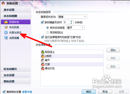 3、在系统设置状态和提醒选项中,点击左边栏中的共享与资讯,如图所示。
