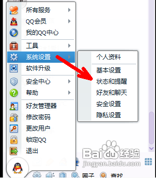 2、在弹出菜单中点击系统设置选项,然后会弹出一系列的次级菜单,点击状态和提醒选项。
