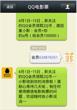 体QQ会员用户又有福利啦!即日起-4月15号只要新添加关注QQ电影票的微信公众号,就可以百分百获得2QB的奖励哟!如果你是QQ的普通用户也不要失望,通过收听转发活动微博也是有机会获赠Q币奖励的。