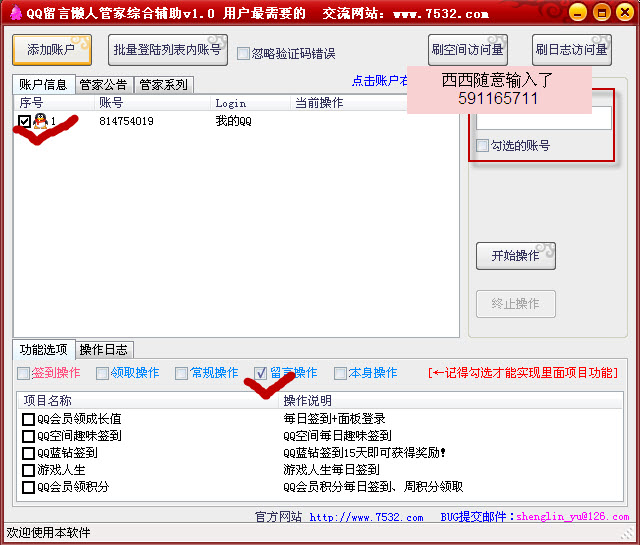 2.选择留言对象qq号,并勾选留言操作!