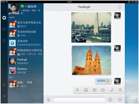 iPadQQ3.0心动版的主界面更加清爽,提供了4套默认的皮肤,还特地加入了备受期待的自定义皮肤功能。同时,它将各种沟通方式的操作项统一收拢起来,使聊天窗口更简洁实用,图片呈现的效果更大,更美观。