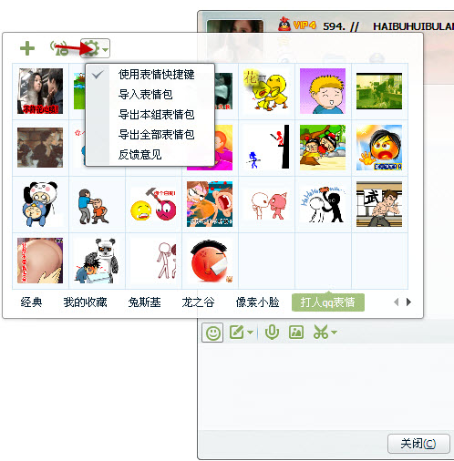 第三步:点击左上角“设置”选择“导出本组表情包”表情,当然你导出全部qq表情就选择“导出全部表情包”如图: