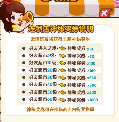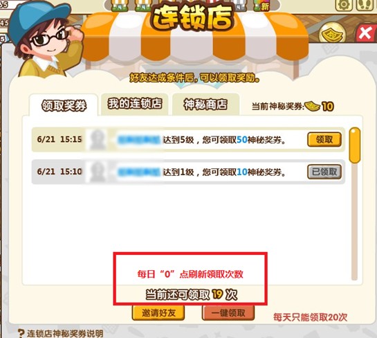 1、连锁店好友的等级每提升至一个阶段都可以领取一次奖励;