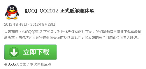 大家期待很久的QQ2012 正式版,对外优先体验啦!在此,我们诚邀您申请并下载体验最新版本,同时欢迎大家将体验感受及时反馈给我们,您反馈的每个问题都会有专人跟进。