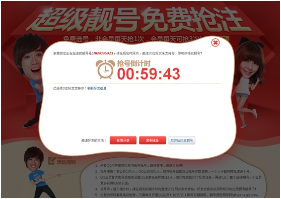 2、抢号后,进入倒计时,请在规定的倒计时内邀请20位网友来支持你。好友支持完成后即可开始注册拥有靓号了!