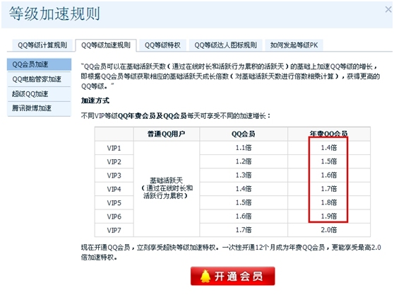 不同VIP等级QQ年费会员及QQ会员每天可享受不同的加速增长: