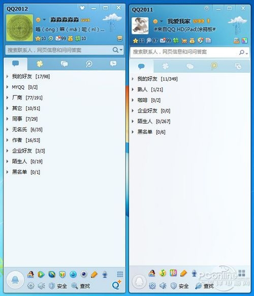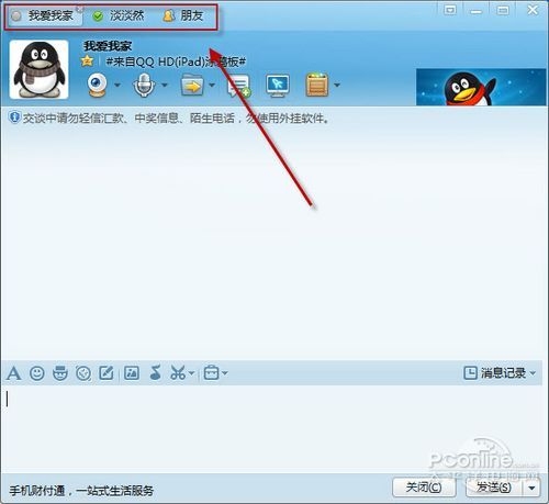 终于支持多标签聊天界面QQ2012聊天界面最大的变化莫过于终于支持多标签聊天界面。也就是说多个聊天窗口支持合并到一个窗口中,这样用户同时和多位好友聊天时就无需打开多个聊天窗口了,其中群聊窗口也支持合并哦。用户可以从从多标签聊天界面的分类标签的不同图标来看出好友的在线状态以及区分是否群聊窗口。当用户最小化聊天窗口到任务栏时,有新消息依然有提示但是却无法快速区分是哪个联系人发来的信息(多标签状态下)。话说多标签聊天界面早就在QQ概念版中实现,可是腾讯就是不肯加入到用户常用的QQ版本中来。用户可以通过将标签拖出聊天窗口范围外释放的操作方式来将某个聊天窗口独立出来,而某个独立窗口可通过拖拽头像到其它窗口释放的形式来进行两个窗口的合并操作(拖动窗口边框是无法合并的)。
