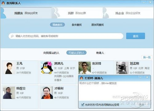 结交更多的朋友查找联系人窗口也有了新的变化,首先是变得大气了,不再是那个小小的查找窗口,改为了大气的全新布局窗口。查找方式划分为了找朋友/找群/找企业三大类别,旧版中的“真实姓名查找”项给合并到了“找朋友”中变成了“朋友网查找”功能。在“找朋友栏”中有着“可能认识的人”推荐,方便用户扩大自己的朋友圈,并且用户可以直接和这些“可能认识的人”进行打招呼沟通。有人跟你打招呼后将进入用户的“向我搭讪的人”分类中。