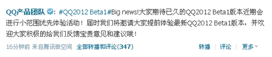 备受关注的QQ2012 Beta1 今天终于有了新进展——据QQ产品团队透露,QQ2012 Beta1版本近期会进行小范围优先体验活动,届时将邀请大家提前体验最新QQ版本,并欢迎大家积极反馈宝贵意见和建议。