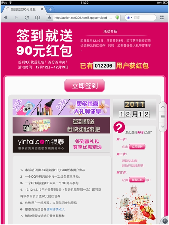 qq浏览器HD(iPad)2.0新版发布之际,联合精品购物B2C银泰网做签到送红包活动,活动时间内只要签到3次即可获得90元银泰红包一个,由于100%的中奖率吸引了大量iPad用户下载QQ浏览器HD(iPad),并签到抢红包。