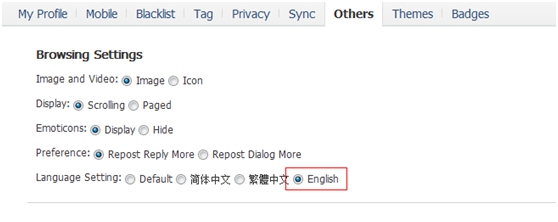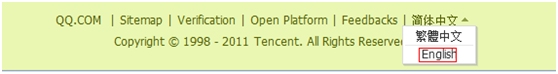 三是在腾讯微博底部右侧将“语言”选择为“英文”: