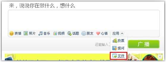 要给众多听众分享自己电脑里的视频和资料?或是想下载别人分享的精品视频、资料、文档?不少用户今天突然发现腾讯微博里多了个新功能:广播可以上传文件——没错,种子党的春天来了!博主传播文件信息更便捷,听众们有福了!不过目前广播带附件功能暂只有部分LV4用户、LV5及以上用户可以抢先体验,后续将逐步开放。