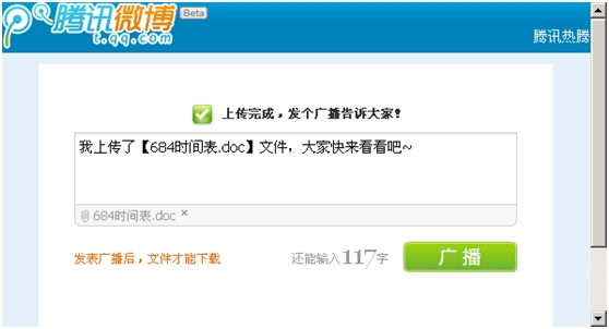 据笔者测试,上传好附件后,需要发表广播才可以下载,此外广播大于10.00MB的文件将自动保存在文件中转站中,有效期为30天。