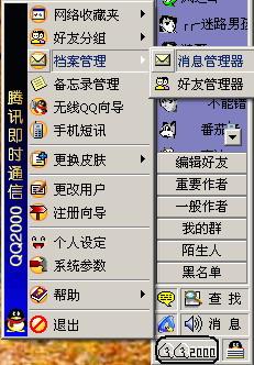 登陆QQ之后,点击QQ程序主接口左下角的QQ2000的图标,在弹出的菜单中选择档案管理下的“消息管理器”,打开了消息管理器对话框。
