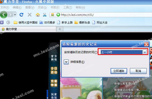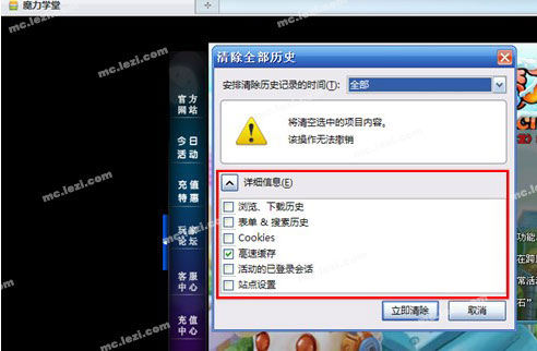 3、点击详细,将“详细信息”里的选项“高速缓存”勾取,然后点击“立即清除”按钮,见图: