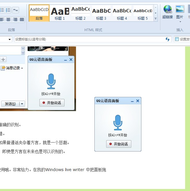 另外,QQ与语音面板可以在系统中任意一程序使用哦。非常给力。在我的Windows live writer 中把面板拖过来也可以使用滴。见图