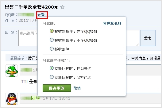 群邮件读信界面新增设置选项,在您读信时就能轻松设置该群的新邮件是否在QQ弹出提醒、已读邮件有新回复时是否标记回未读,让你轻松便捷管理群邮件。