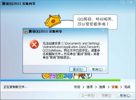 4、在安装那一步,卡住了,Mygod,一个从来没有碰到过的问题遇上了,真是衰,难道是衰哥了。错误如下:无法创建目录 C:\Documents and Settings\Administrator\Application Data\Tencent\QQ\SafeBase。同名文件已经存在。请重命名或删除文件,然后单击“重试”按钮,或者单击“取消”按钮退出。