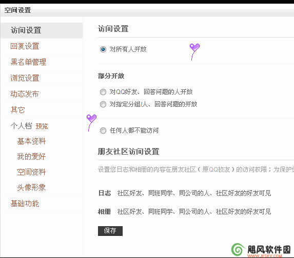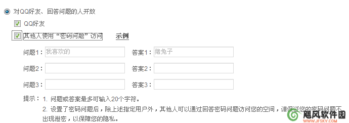 第二个是部分开放,部分开放有两个选项。我们先来说对QQ好友、回答问题的人开放,这个选项可以让你QQ里面的所有好友查看你的空间,对于非好友说,你可以再勾选其他人使用“密码问题”访问,答对一样可以查看您的空间。如果您没勾选此项,你的非好友用户就没有对您空间查看的权限。