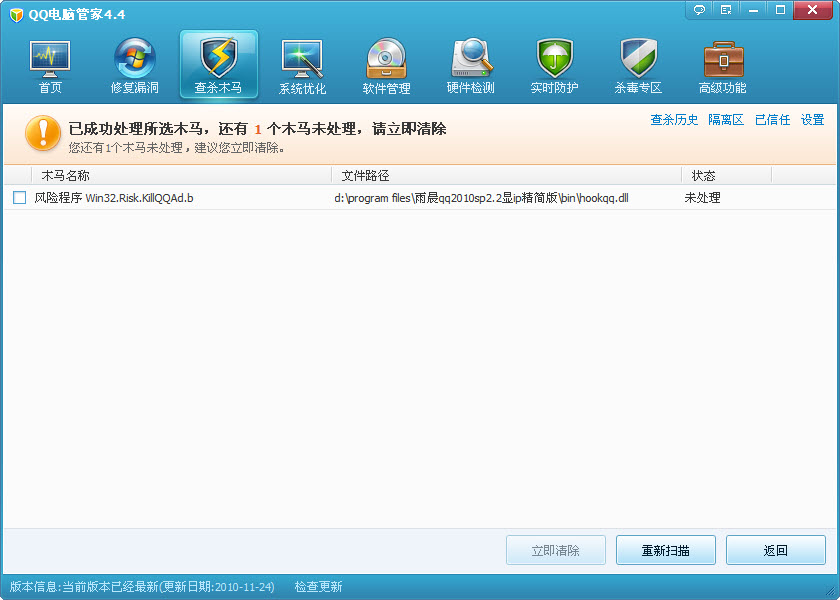 装上QQ电脑管家后,好家伙,马上就给我把补丁装上,然后再帮我查杀了木马,都有图证。
