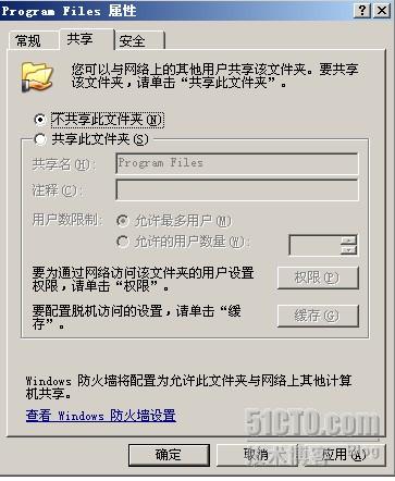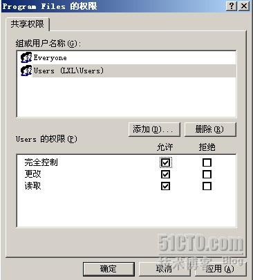 然后找到program files 的文件夹,点击右键,选择“共享和安全”,选择“共享该文件夹”,发现“权限”选项可以进行设置,点击“权限”,选择“添加”,点击“立即查找”发现如图所示,