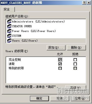 击HKEY_CLASSES_ROOT,选择“权限”,选择“users”,在下面选择“完全控制”,点击“应用”“确定”。如图所示,。
