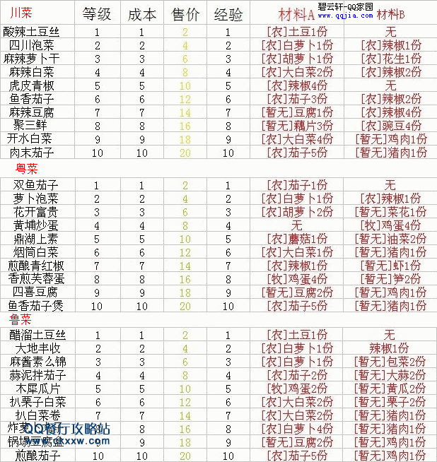 首先看QQ餐厅来里卖的三大菜系,每样10个,从下表看出,菜的等级越高挣钱越多,经验也越多。