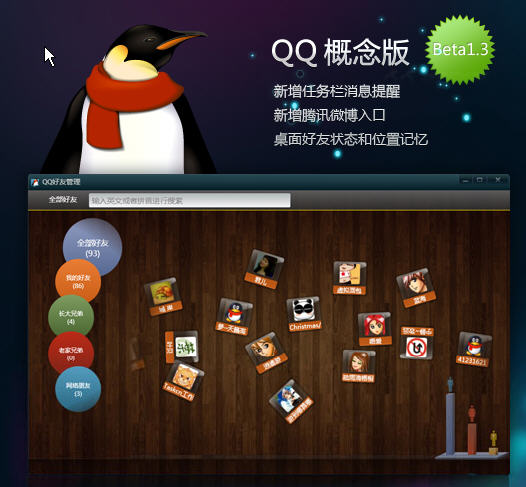 QQ 概念版是腾讯首款NUI(自然用户交互)产品,全面实现了多点触摸操作。在实现IM的基础功能外,QQ概念版还推出了动感相框、动态背景、多Tab聊天窗口、3D交互、矢量界面、桌面好友等一系列新功能、新体验以及Windows7的重要新特性