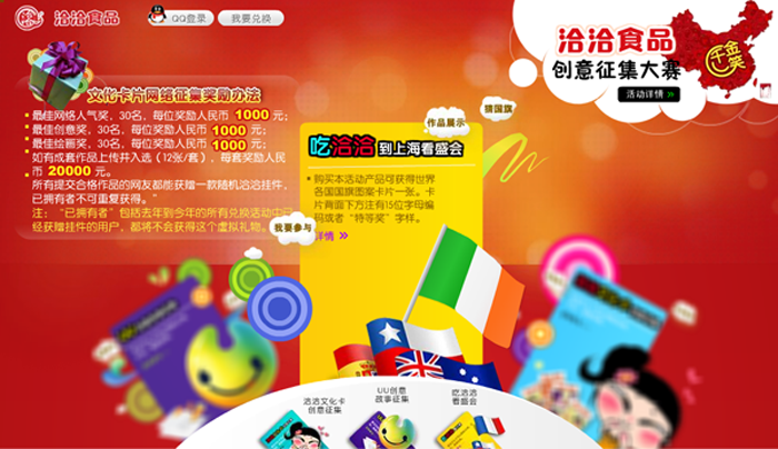 洽洽食品创意征集大赛,全部QQ用户均可登陆后参与在线涂鸦活动,用户可在涂鸦形式之外,直接提交符合要求的图片,还可以参与猜国旗游戏和购买洽洽产品刮刮卡兑奖活动。丰富精美的奖品等你来拿,赶快来参与吧!