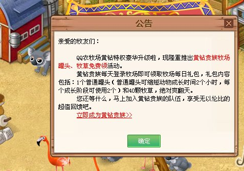 QQ农牧场黄钻特权豪华升级啦,现在隆重推出黄钻贵族牧场罐头、牧草免费领活动。黄钻贵族每天登录牧场即可领取牧场每日礼包,礼包内容包括:1个普通罐头(普通罐头看缩短动物成长时间2个小时,每个成长几段可使用2个)和40颗牧草。