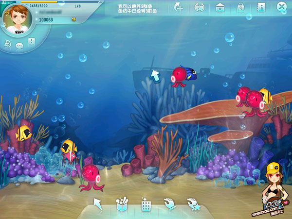 飞车鱼坊的整个界面晶莹剔透,是不是相当的漂亮?水底的气泡和光影表现得惟妙惟肖,和缤纷海底植物以及各种鱼儿相得益彰,让我们仿佛置身于奇妙的海底世界中。不同的鱼儿还会自言自语哦,真有意思!