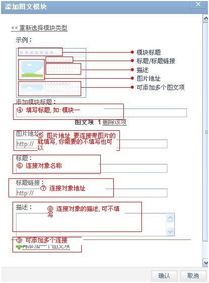 4 添加友情链接时,点击模块右边的“设置”小图标,在图文项根据需要添加图片地址、标题、链接、及描述,点击确定保存。