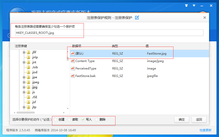 比如我们想禁止所有程序对.jpg后缀文件默认启动程序的修改,可以新建一条规则,并选择注册表路径,并勾选修改动作,那么将自动阻止有程序试图修改.jpg后缀文件默认启动的程序操作。