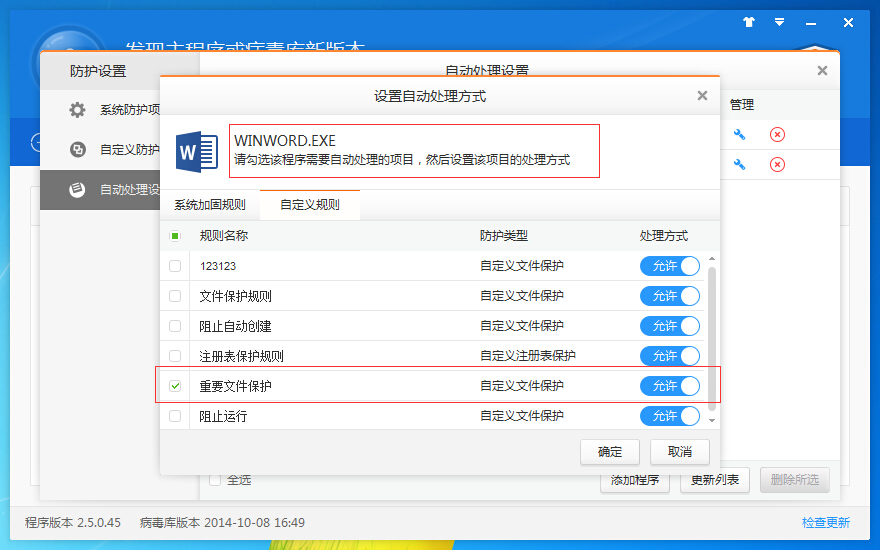 结合之前的保护重要文件规则为例,比如我们需要保护“E:\重要文件”目录中的内容,同时又希望允许使用Word修改该目录中的文档,那么我们可以在自动处理规则中添加word程序,然后勾选文件保护的那条规则,选择右侧的允许即可。这样可以达到禁止除了word以外所有程序修改“E:\重要文件”这个目录下的文件的防护目的。