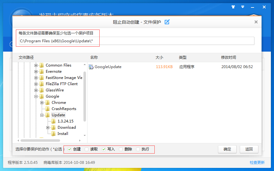 比如我们想禁止Chrome自动下载更新文件,可以新建一条规则后选择chrome的update目录,并勾选创建、写入动作,那么将自动阻止chrome的update自动往该目录下载文件。