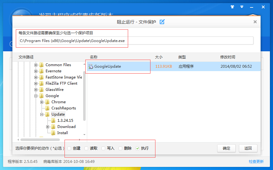 比如我们想禁止Chrome启动时自动启动update程序进行更新,那么可以新建一条规则,并选择googleupdate.exe为操作对象,勾选动作中的执行项目,那么将自动阻止googleupdate.exe这个程序的执行。