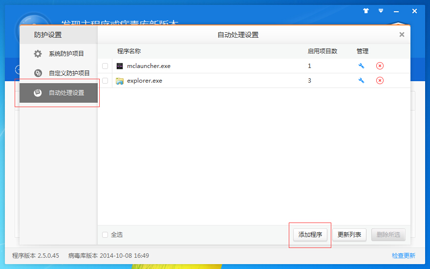 1,在系统防护设置中选择自动处理设置分类,在界面底部选择添加程序按钮